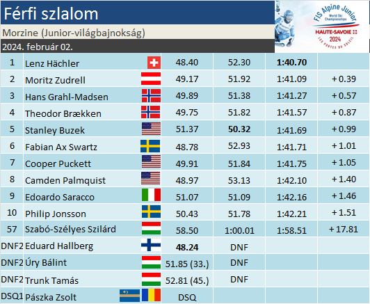 A jobb eredményre esélyesebb magyar fiúk sajnos nem jártak sikerrel este. Úry Bálint nagyon korán, Trunk Tamás korrekt részidő után a lejtő második felében búcsúzott. Szabó-Szélyes Szilárd azonban leért, a 60. helyen, hat sízőt maga elé engedve.