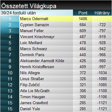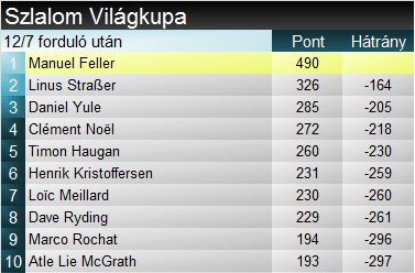 A szakági világkupában Feller a mai újabb erős pontszerzéssel tovább növelte előnyét a hibázó Straßerrel szemben. Yule a szerencsés győzelemmel a szakági harmadik helyére ugrott előre, igaz hátránya 200 pont feletti a naptár felén már túljutva. Az összetett elejére komoly hatást nem gyakorolt a mai verseny. Az élmezőny egyetlen szlalomosa, Feller újabb kisebb lépést tett az összetett dobogó felé. Meillard az utóbbi hetek egyre erősebb eredményei révén átugrotta a sérült Schwarzot és Kildét, így immár az összetett 5. helyét foglalja el.
