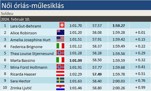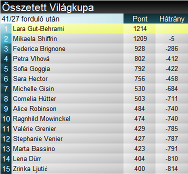 Lara Gut-Behrami extázisban: a 9. helyről fordítva újabb győzelmet aratott, ezzel átvette a vezetést összetettben Shiffrintől! Egy nagy hibával együtt alig maradt el Haaser legjobb délutáni idejétől, s még egy kis szerencséje is volt, hiszen egyetlen századdal maga mögött tartotta Alice Robinsont. Amelia Josephine Hurt a hatodik helyről dobogóra került, hét századdal megelőzve Brignonét. Az első után még vezető Bassinót – Stjernesund mögött – visszacsúszott a 6. helyre. A szakágiban már csak Fede’ van versenyben a svájcival, hátránya két versennyel a vége előtt 135 pont.