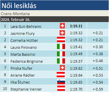 Lara Gut-Behrami változatlanul bombaformában: megnyerte az első lesiklást Crans-Montanán, ezzel 100 pont fölé növelte előnyét összetettben, egyszersmind nagyon úgy fest, hogy a királyszámban is jó esélyei kínálkoznak a kristálygömbre. A második helyen holtverseny alakult ki Cornelia Hütter, valamint a világbajnok Jasmine Flury között. Goggia hiányában sem szerepelt rosszul az olasz küldöttség: Pirovano-Bassino-Brignone sorrendben ők vitték el a 4-6. helyeket. Fontos: sérülés nem történt a megkurtított, lent átformált pályán.