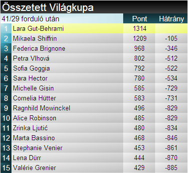 A szakági világkupában az éllovas Goggia előnye 3 versennyel a szezon vége előtt vészesen fogy. Gut-Behrami már csak 41 pontra van, de további 3 síző is már 100 ponton belülre zárkózott. Nehéz elképzelni, hogy a sérült olasz bárhogyan az élen maradna, inkább Lara esetében kezdhetünk számolgatni, meglesz-e 3 szakági cím is. Összetettben a svájci már egy győzelemnyinél nagyobb előnnyel rendelkezik, és minthogy Shiffrin esetében erősen kérdéses, hogy a következő két gyorsasági hétvégére visszatérne, így Gut-Behrami egyre nagyobb esélyese a szezonnak.
