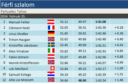Manuel Feller remek második futamot síelt az igen leromlott pályán, így a harmadik helyről kettőt előre ugorva győzött Palisades Tahoe-ban. A második helyet megőrizte Clèment Noël míg Linus Straßer a harmadik helyre csúszott vissza. Ezzel Feller hatalmas lépést tett a szakági cím felé, előnye már 200 pont feletti a bajorral szemben, három versennyel a szezon vége előtt.