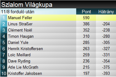 Manuel Feller a 6. győzelmét aratta, a negyediket idén. A korábbi notórius kieső Ryding mellett az egyetlen versenyző, aki minden versenyt pontszerzőként zárt, ráadásul mindegyiken a legjobb ötben. Clèment Noël idén 4., összességében 24. alkalommal állt dobogóra. Linus Straßer ma jubilált, 10. dobogóját szerezte szlalomban.