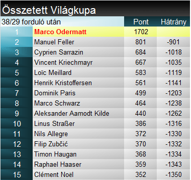 Három versennyel a szezon vége előtt matematikailag még négyen nyerhetik meg a szakági világkupát, a mai első négy versenyző. Feller előnye azonban 204 pont Straßer előtt, azaz már jövő héten megtörténhet a bajnokavatás. Noël és Haugan esélye inkább már csak matematikai. Összetettben Feller kezdi megszilárdítani második helyét Sarrazinnel szemben.