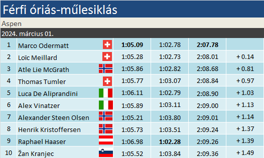 Marco Odermatt (1.) önmagához mérten is agresszívebb volt, oly közelről támadta a kapukat. Hibák voltak bőven, tempója ezt kompenzálta. Élre állt szűk 2 tizeddel, de volt még benne tartalék. Žan Kranjec (4.) remek technikával vágódott a fenti kanyarokba, a jeges szakasz lankásabb szektorában aztán belehibázott egyet, ami értékes időbe telt. A harmadik szektorban azért durrantott egy topidőt. Manuel Feller korán vétett egy sízési hibát, némi akrobatikával mentette a helyzetet. Amúgy is fájó hátába akkor belenyilallt valami nem kellemes érzés, ki kellett állnia. Az ORF-nek adott interjúja alapján a vasárnapi szlalomra rendbe fog jönni. Alexander Steen Olsen (2.) ütős dinamikával együtt tartotta a jó íveket, s bár itt-ott túlságosan kicsúsztak lécei, a céllejtőre megint összeszedte magát, így ő lett ma Odermatt legfőbb üldözője.