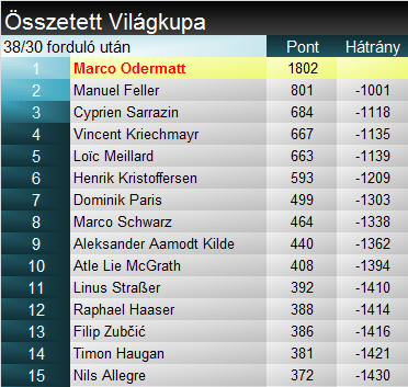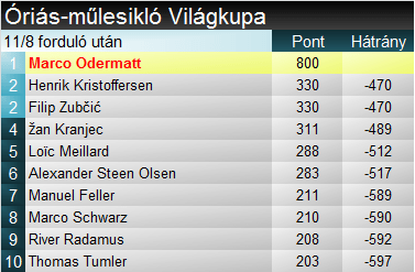 Kristoffersen (8.) próbálkozott becsülettel, de egyszerűen nem volt meg a sebessége. A célban bizonyára a norvég káromkodásból hallhattunk rövidke rezümét. Kranjec (10.) nem támadott fent úgy, mint az tőle elvárható lett volna. A hullámok végén aztán csúnyán lecsúszott, ami maga után vont egy érdemibb hátracsúszást. Meillard (2.) bátor, masszív kis menetet rakott le az asztalra. Az első kanyartól kezdve kockázatot vállalt, jutalma pedig komoly előnnyel kivívott biztos dobogó volt. Steen Olsen (7.) csúszása nem volt optimális, fordulói rendre túl szélesek voltak. Folytonosan veszítette az időt, messzire került ma a dobogótól. Odermatt (1.) lécei ellenben megfelelően tapadtak, s bár megint volt pár megingása, a küzdelem a végén ismételten a javára dőlt el.