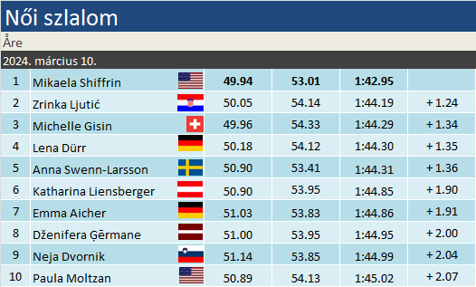 Délelőtti, itt-ott félszeg menete után délutánra úgy igazából visszatért Mikaela Shiffrin! Másodperc fölötti fölénnyel nyerte meg az Åre-i szlalomot, egyszersmind a nyolcadik szakági kristálygömbjét. Az amerikai mellett a zsinórban harmadjára második Zrinka Ljutić (+1.24.) és Michelle Gisin (+1.34) állhat még fel a dobogóra. A pódium sorsa elképesztően szoros csatában dőlt el, hiszen Lena Dürr egy, Anna Swenn-Larsson pedig kettő századdal szorult le onnan. Liensberger végzett a hatodik, Aicher karriercsúccsal a hetedik, Ģērmane a nyolcadik, Dvornik a 9., Moltzan pedig a tízedik helyen. Az eredmények ismeretében eldőlt, hogy a regnáló világbajnok St-Germain lemarad a Világkupa-döntőről, Lara Colturi viszont még ifjúsági korúként mindkét technikai számban elstartolhat Saalbachban. Federica Brignone becsúszott a pontszerző helyekre, de 27. helyével nem váltotta meg a világot, ami Gut-Behramival folytatott összetett küzdelmét illeti.