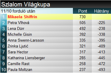 Maradtak négyen, az a négy, aki lélegzetvételnyi előnyt szerzett magának délelőtt. Dürr (4.) kelleténél óvatosabban viseltetett fent, a középső szakaszon is inkább a biztos ívekre fókuszált. A céllejtőn nyomta meg igazán, ez pedig elég volt arra, hogy egyetlen századdal a svédek potentátja előtt maradjon. Ljutić (2.) középtájon könnyedén próbált áthaladni, így noha a topdinamika hiányzott nála, a szűk ívek élen tartották a horvát lányt. Gisin (3.) túl keményen vetette be léceit az első szektorban, a céllejtőt ellenben remekül megoldotta. A biztos dobogó tudatában örömködött. Ljutić várva várt első VK- sikere nem ma realizálódott. Shiffrin (1.) elejétől fogva uralta a lejtőt, ahol kellett, picit visszább vett, ahol szükséges volt, tempót váltott. Az utolsó letöréstől kezdve meg úgy haladt, mint a gőzvonat. Megint leiskolázta a mezőnyt!