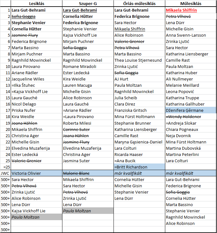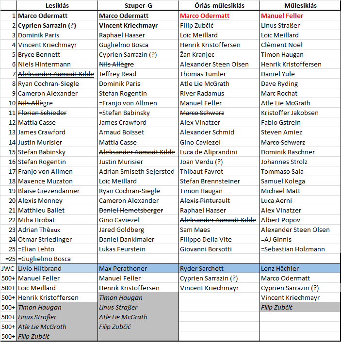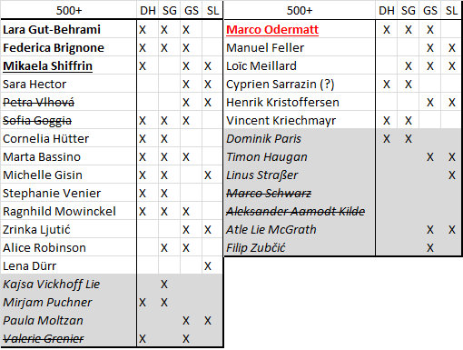 A lenti táblán látható az indulási jogot szerző sízők listája, szakáganként. A már biztos győzteseket pirossal jelöltük, míg a nyílt küzdelem esetén félkövérrel láthatók a matematikai eséllyel rendelkezők. Aláhúzva a szakági címvédők, áthúzva a sérülés miatt távolmaradókat jelöltük. Kékkel a junior-világbajnokot emeltük ki. Az 500 pontosok esetén csak indulási jogot jelzünk, kivéve a lesiklást, ahol az edzésen nem szereplőket már kihúztuk.