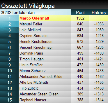 - Sarrazin 3., Odermatt 9., ekkor pontegyenlőséggel, eggyel több győzelemmel Sarraziné lenne a kristálygömb;