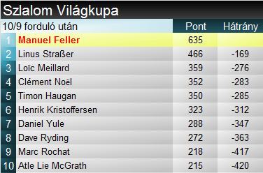 Straßer helye egyébként szintén betonbiztos a második helyen, a számban két hete első győzelmét ünneplő Meillard 3. helye viszont közel sem. A svájcit 10 ponton belül követi Noël és Haugan is, de 36 pontos hátrányban álló, egyre inkább erőre kapó Kristoffersen is könnyedén felérhet még a dobogóra. Szlalomban születhet meglepetés, így elvileg Yule és Ryding év végi bronzza sem teljesen kizárt, de komoly meglepetés lenne.