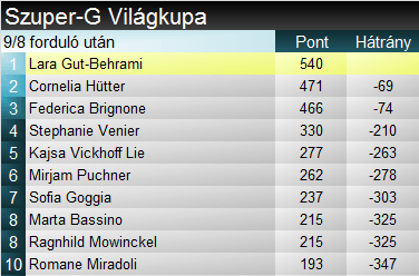 A fordulat esélye talán szuperóriásban a legnagyobb. Habár Lara Gut-Behrami 69 pontos előnye nem az a könnyen ledolgozható fajta, a Szuper-G épp az a szám, amiben viszonylag kiegyenlített és népes az élmezőny, a meglepetést pedig az időjárási helyzet alakulása gyakorta ki szokta provokálni. Az ötödik SG- trófeához – amivel beérné a csúcstartó Seizinger- Vonn- Svindal- Maier négyest – legalább egy nyolcadik helyezés kellene Larától a jövő pénteken. Ez erőteljesen benne van a pakliban, elvégre 2022 decembere óta csupán kétszer nem sikerült ez neki.