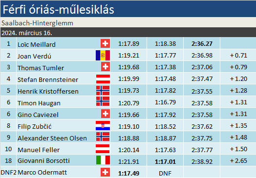 Loïc Meillard élete formájába lendült az idény utolsó szakaszára. A szakág vb-ezüstérmese a tavalyi schladmingi éjszakai verseny után győzött újra óriásban, összességében negyedjére csendült fel a tiszteletére a svájci himnusz. Egyéni pontrekorddal először állhatott szezondobogóra bármelyik szakágról is legyen szó. Az összetettben ugyanez szinte biztosra vehető, csak az a kérdés, ő vagy Feller lesz-e Odermatt elsőszámú üldözője.