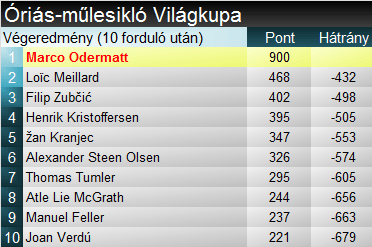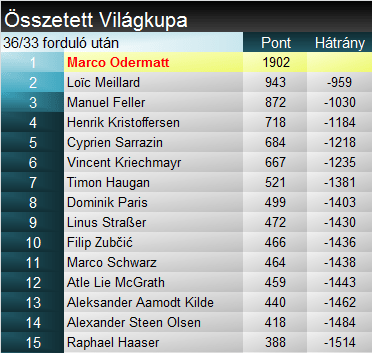 Marco Odermatt tucatnyi győzelem, 13 zsinórban jegyzett dobogó és egy egészen a 2021-es cortinai világbajnokságig visszanyúlt célba érési sorozat után esett ma ki. Idénye ezzel együtt egyike a valaha volt legdominánsabbnak. Csaknem kétszer annyi pontot szerzett, mint Meillard a második helyen, összetettben pedig közel kétszeres pontmennyiségnél tart. A kétezres ponthatárt ezzel együtt nagy valószínűséggel át fogja lépni, ha az időjárás engedi a gyorsasági versenyek megtartását. Egymás után harmadjára foghatta kezébe az óriás-műlesiklók kristálygömbjét, erre korábban csak Ingemar Stenmark és Marcel Hirscher volt képes.