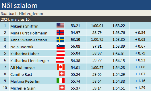 Nem akármilyen kötéltáncot hozott a második futam, a 10 fokos hőmérséklet mellé kapott a lejtő egy kis áprilisi zuhét… Mikaela Shiffrin győzelemmel, a 60. szlalomsikerével vehette kezébe nyolcadik szakági kristálygömbjét! Fél másodperccel verte a nyolcadik helyről dobogós Mina Fürst Holtmannt, míg a délelőtti éllovas Anna Swenn-Larsson nagyon nehéz helyzetekből mentve épp felfért a pódiumra. 4 századdal megelőzve a 17 helyet javított Neja Dvornikot. Lena Dürr 15. helyével épp befért a pontzónába, amivel három ponttal beelőzte Vlhovát, így másodikként zárt a szakági tabellán. Sokan kiestek, köztük a két horvát lány. Ljutić győzelmi esélyt dobott el, míg Popović megsérülhetett.