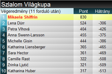 Mikaela Shiffrin nyolcadik alkalommal hódította el a szlalomosok kristálygömbjét. Ezzel beérte a csúcstartó Ingemar Stenmarkot. A tizenegy versenynapból hetet megnyert, dominanciája csak Vlhová kidőlésével vált világossá. Nagy kár, amiért lemaradtunk kettejük kard-ki-kard csörtéjéből. A szezondobogó második fokára – mai szerény szereplése ellenére – Lena Dürr állhat fel, négy dobogójával és kiegyensúlyozott teljesítményével rászolgált két évvel ezelőtti bronzérme utáni előrelépéssel. A 3. helyen Vlhová végzett.
