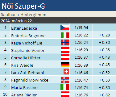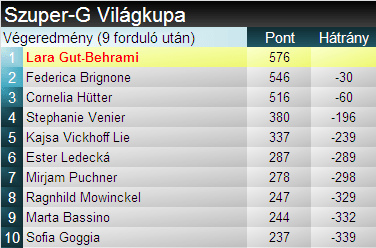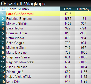 Összetettben már biztossá vált, az első 5 helyen matematikailag sem lesz változás: Gut-Behrami mellé majd két másik korábbi összetett győztes állhat a dobogóra, Brignone és Shiffrin.