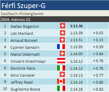 Svájci fiesztával ért véget a szuper-G szezon a férfiaknál! Annak ellenére született hármas svájci dobogó, hogy Marco Odermatt mindössze 5. hellyel biztosította szakági elsőségét a 6. helyen végző Kriechmayrrel szemben. A győzelmet, karrierje során először, Stefan Rogentin szerezte meg, 3 századdal Loïc Meillard előtt, míg Arnaud Boisset első dobogóját ünnepelhette. Az első 5-be Sarrazin fért be, belerondítva némileg a svájci blokkba. A versenyhez hozzátartozik, hogy a meleg nagyban segítette a korai rajtolókat, a dobogót 6-4-5 rajtszamokkal tárolták le a svájciak. A szakágiért csatázóknak a 14-15-ös rajtszámmal már nem sok esélyük volt.