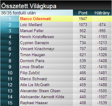 Bár még csak 5 síző ért célba, de hármas svájci vezetésnek örülhettek Meillardék, ráadásul érkezett Stefan Rogentin (1.). Remek rajt után, kisebb bizonytalanság miatt még egálban állt Meilard-ral féltávnál, de a végén a gyors kanyarokban talált még 3 századot honfitársával szemben. Cyprien Sarrazin (4.) kisebb kényszerpihenő után tért vissza épp a döntőre, és láthatóan vadságából mit sem vesztett az utóbbi hetekben. Két komolyabb mentésre is szüksége volt hogy eljusson a célig. Összességében jól hangolt a lesiklásra, ahol esélye lesz még a kristálygömbre. Nils Allègre (12.) középen jelentős teret vesztett, ezzel jelentősen lelassulva.