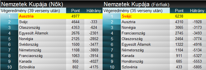 A Nemzetek Kupájának összesítését – toronymagasan – Svájc nyerte meg, az elmúlt öt szezon leforgása alatt még negyedszer, összességében 10. alkalommal. A szlalomot kivéve valamennyi szakágban a helvétek gyűjtötték a legtöbb pontot, ott kerek 400 ponttal jobbnak bizonyultak az osztrákok. A harmadik helyet Olaszország szerezte meg, főként a női szekcióval ütötték ki a norvégokat, még ha Kilde hiányában a skandináv gyorsasági szakágak sem remekeltek. A férfiaknál demoralizáló fölényre tett szert Svájc, zsinórban ötödjére vitték a kupát. Egyedül szlalomban kaptak ki az osztrákoktól. A harmadik helyet Norvégia szerezte meg, főként a technikai szakágak miatt. A nőknél viszont visszavágott Ausztria a svájciaknak. A két gyors számban egyértelműen népesebb ott a merítési lehetőség, tetejében a szomszédnál beütött sérüléshullám is a malmukra hajtotta a vizet. Érdekesség, hogy a svájciak egyetlen szakágban sem végeztek élen, óriás-műlesiklásban az olaszok, szlalomban pedig az amerikaiak szerezték a legtöbb pontot.
