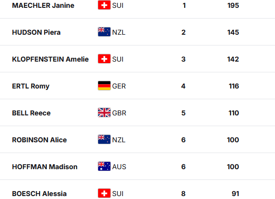 Az összetettet végül Mächler nyerte meg Hudson előtt, míg harmadikként Klopfenstein zárt. Utóbbi brit lány édesapja és nagybácsija a 80-as és 90-es években rendszeres résztvevője volt a VK- sorozatnak, vb-knek és olimpiáknak egyaránt.