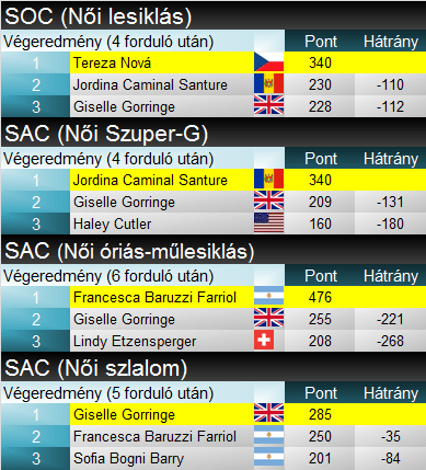 Habár két második hellyel kezdett, Szuper-G-ben nem rúgott igazán labdába a cseh lány. A trükkösebb gyors szám díját így az emlegetett andorrai sportoló vihette haza. Santurel 100%-os pódiumstatisztikával és két sikerrel, utcahosszal vitte a tabella első helyét. Cutler és Gorringe nyert még futamot.