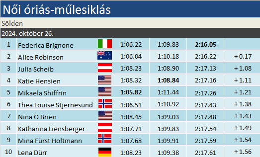 Alice Robinson 22 éves létére már 11 VK- dobogónál tart. Sölden 2019-es győztesével kapcsolatban a jelek szerint igaznak bizonyultak a remek formáról szóló hírek. Az osztrákok nagyon régóta vártak arra, hogy hazai óriás-műlesikláson TOP3-as helyezést ünnepelhessenek a nők között. Egészen 2014-ig, Anna Veith – Shiffrinnel megosztott – diadaláig, továbbá Eva-Maria Brem dobogójáig kell visszamennünk a legutóbbi precedensig. A 26 éves stájer Julia Scheib mai szereplése nem a semmiből jött, hiszen az elmúlt egy évben ötször végzett a TOP10-ben, egyszersmind vitán felül ő volt a csapat zászlóshajója. Nem mellékesen Fede’ és Scheib révén duplán örömittas napot zárt a Rossignol. Robinsont és Shiffrint kivéve csak az általuk támogatott sízők zártak a legjobb nyolcban.