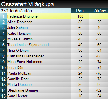 Ellenben fent sok volt a döccenő az olasznál, Robinson (2.) ennek megfelelően továbbépítette fórját, mintegy 8 tizedre. A meredek végére picit megint elfogyott, a lankára pedig másodjára sem érzett rá. Szorosan, de kikapott Brignonétól, igaz ő megint rosszabb látási viszonyok közt síelt. Shiffrin (5.) is, egy több helyütt verhető menettel szállt szembe. Ehhez képest hozta délelőtti taktikáját, vagyis odafent óvatosra vette figurát, majd a letörésnél teret veszített. Próbálkozott mindennel, de a meredek végére mintha elfogyott volna a szufla. Meglepetésre a dobogóról is leszorult, sőt még Hensientől is kikapott! A második leggyöngébb délutáni futammal. Az osztrákok pedig teljesen váratlanul pódiumot ünnepeltek!
