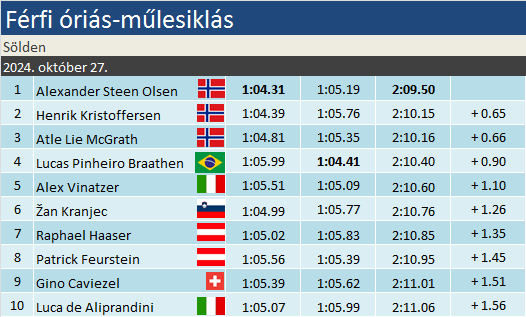 Alexander Steen Olsen második győzelmét aratta a Világkupában, az elsőt óriás-műlesiklásban. Dobogóra is csak másodjára (összességében harmadszorra) állt GS-ben, a múlt télen Banszkón zárt először TOP3-ban. Henrik Kristoffersen neve mellett a 33-as szám szerepel a dobogós eredmények listáján. Sölden nem az ő lejtője, ehhez képest nagy szó, hogy rögtön a szezonnyitón utoléri előző szezonbeli pódiumai számát. Atle Lie McGrath a harmadik szakági dobogóját jegyezte a mai napon. Aspen után csaknem 8 hónappal újra annak harmadik fokára állt fel.