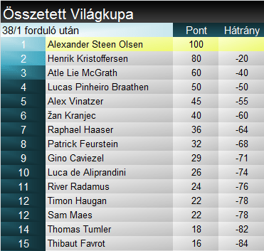 A délelőtt dobogósai közt századok feszültek, a norvég pódium pedig ugyebár betonbiztos volt. Kristoffersen (2.) a lehető legkisebb különbséggel állt élre. A meredeket alaposan megnyomta, a dinamika működött több hiba ellenére. A zárás pedig hiába volt tempósabb, mégsem növelte előnyét McGrath-tal szemben. Akinek arcán érződött, hogy derék Henrik nem a szíve norvég válogatott sportolók szíve-csücske. A norvég/ félnorvég tarolás Zubčić kiesésével vált biztossá. Sokadik késése után nem tudott befordulni a meredek csúcsára rakott balos kapuba. Hátrabillenve csak a védőháló állította meg. Az Odermatt kiesése folytán kialakult versenyhelyzet többeket leblokkolt. Steen Olsen (1.) dolga nem volt különösebben nehéz, Kristoffersen bőven hagyott a pályában. A letörésnél majdnem keresztbe álltak lécei, de ez ritmikáján nem sokáig érződött. Meredeke egészen fölényesen alakult, a záró szektorban pedig durrantott egy topidőt. Kérdés nem volt, 6 és fél tizeddel nyerte élete első VK- óriását!