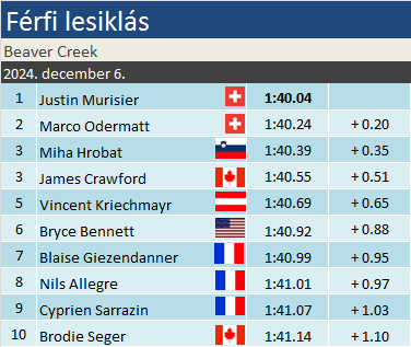 Justin Murisier ezelőtt egy jófajta óriás-műlesiklónak számított, négy 200 pont körüli szezonjába belefért egy szem dobogó is a Világkupában. A gyors számokra való fokozatos átállás eleddig is tartogatott néhány szép eredményt, ám ezt a mait, élete első VK- sikerét nem láttuk jönni. A szakág regnáló világbajnokaként és VK- győzteseként Marco Odermatt volt a mai verseny favoritja. 16. szakági pódiuma csalódást épp nem okozott, lesz még idő javítani. A harmincadik életévében járó Miha Hrobat egykori junior-világbajnoki léte dacára eleddig nem markolta két kézzel a pontokat. Legnagyobb sikere alighanem a courcheveli vb- 8. helye volt a királyszámban. Az edzéseken jókat ment, de ez a mai pódium nem volt benne a levegőben.