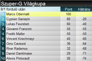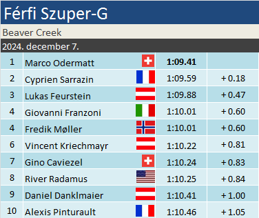 Marco Odermatt ma ténylegesen is megnyitotta a téli szezont. 37. győzelmét aratta a Világkupában, ebből tucatnyit szerzett már szuperóriásban. Felzárkózott az összetett pontverseny harmadik helyére, gyaníthatóan holnap be is fogja előzni az éllovas Kristoffersen-Noël duót. Cyprien Sarrazin második szakági pódiumát gyűjtötte be, a januári wengeni sikere óta várt az újabbra. Lukas Feurstein pedig 2021-es VK- debütálása óta a legelsőre. A korábbi junior-világbajnok a felkészülési időszakban a Dél-Amerikai Kupában fitogtatta erejét, ma pedig megmutatta, hogy a legerősebb mezőnyben is képes nagyszerű eredményekre.