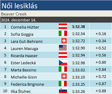 Delia Durrer (30.) vagány sízéséből egy korai hiba alaposan kizökkentette, további küzdelme inkább a veszett fejsze nyeleként üzemelt. Ester Ledecká (6.) rá oly jellemző vehemenciával szelte a kanyarokat. Két szektor után gyakorlatilag meccsnullra állt, s ha nem veszít fél másodpercet az ugrató környékén – vélhetően némi kondicionális nehézség okán, simán dobogóig vihette volna. Nadia Delago (27.) elejétől fogva nem találta a nyomvonalat, fenti veszélyes pillanatai után pedig elfogyott a mersz Emma Aicher (43.) futamából. Elvesztette súlypontját a fenti hullámon, nagyot kellett mentenie. Lauren Macuga (4.) mindenkinél gyorsabb volt 2 tizeddel az alsó szakaszon, amivel közvetlenül a TOP3 mögé sorolt. Kisebb hibái ellenére végsőkig koncentrált maradt. Egyedül a felső szektort kárhoztathatja. Isabella Wright (35.) épp ott hozott topszektort, egyébiránt rendkívül zaklatottan síelt. Elvedina Muzaferija (25.) elejétől fogva nem érzett rá semmire, tétovásáért cserébe legalább olcsó hibákat nem vétett a bosnyák. Romane Miradoli (19.) zárta az első harminc indulót. Az utolsó két szektorra elfogyott lendülete, egyébiránt jó lett volna egy TOP10-es eredményre. Tekintetbe véve azt, hogy a nyári felkészülést hátfájdalmak tették vontatottá, nem volt olyan rossz kezdés.