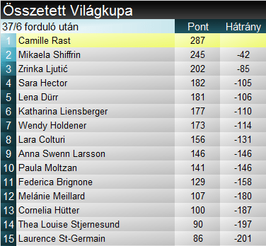 Stephanie Venier (17.) nem mutatott biztató formát az edzéseken, így valahol várható volt az a sok bizonytalanság a technikás részen. Komoly gondjai voltak az ívtartással, pár századdal szorult Puchner mögé. Szakági címvédőként vágott neki a pályának Cornelia Hütter (1.). Impozáns felső szakasszal hangolt a számára kedvesebb folytatásra. Kéttizedes előnye a sebességtartó részen elolvadt ugyan, de a korábbiaknál hosszabb „Golden Eagle” alapján sejthető volt, pörgős záró szakasz vár rá. Legjobb utolsó szektorral, másfél tizeddel élre állt az osztrák.