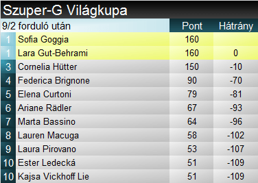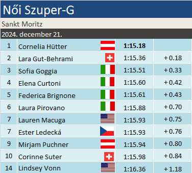 Cornelia Hütter ott folytatta ezen a télen, ahol a múltkoriban abbahagyta. Negyedik győzelmét aratta a 2024-es évben, s még van előtte egy lehetőség szaporítani összességében nyolcnál tartó sikerlistáját. Lara Gut-Behrami a 44., míg Sofia Goggia a 16. dobogós helyét szerezte szuperóriásban. A szakágit ők ketten vezetik holtversenyben. Ami az összetettet illeti, még kitart Camille Rast előnye, de holnap gyaníthatóan a mai három dobogós közül valaki meg fogja előzni.