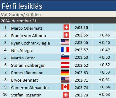 Franjo von Allmen másodszor állt dobogóra a Világkupában, először a királyszámban. A korábbi 3x junior-vb-ezüstérmest mindinkább komolyan kell venni. A Saslongon hagyományosan extraerős amerikai lesiklók mai reprezentánsa Ryan Cochran-Siegle lett a mai napi pódiumon. Harmadszor zárt a TOP3 közt a 32 éves vermonti sportoló.