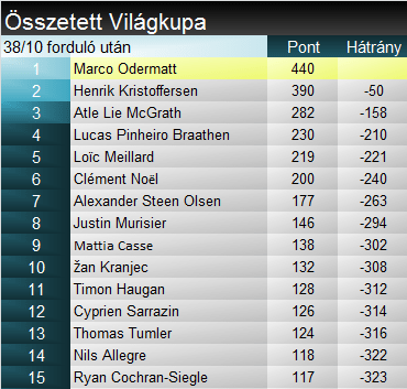 Miután belelendült, annak rendje, s módja szerint visszatért a verhetetlen Marco Odermatt. Karrierje újabb mérföldköréhez érkezett 40. Világkupa- győzelmével, ezzel beérve a 80-as évek világklasszisát, Pirmin Zurbriggent. Magyarán még egy siker választja el attól, hogy 27 éves korára ő legyen minden idők legeredményesebb svájci férfi sízője. (Összességében Schneider és Gut-Behrami áll előtte.) Odi átvette a vezetést mind a szakági, mind az összetett tabellán. Mondhatni, helyre áll a világ rendje. Nem mellékesen az utolsó klasszikus lesikló lejtőn is megszületett első sikere, valamelyik gyorsaság számban.
