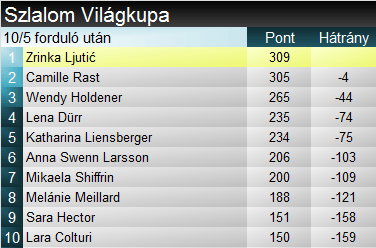 Zrinka Ljutić egy hétre karrierje első, Semmeringen aratott győzelme után rögtön megszerezte zsinórban a másodikat is. Kranjska Gorán legutóbb horvát síző 12 éve győzött, akkor Ivica Kostelić aratta karrierje utolsó sikerét. A horvát fenomén mai eredményével átvette a vezetést a szakági és az összetett pontverseny élén is. Wendy Holdener és Anna Swenn-Larsson egyaránt másodszor végeztek idén a dobogón, killingtoni holtversenyes második helyük után. A svájci 51. alkalommal végzett a legjobb háromban, ebből 37-szer szlalomban, míg a svéd lány esetében 15-ből 13 szlalomos top eredmény ugyanez az arány.