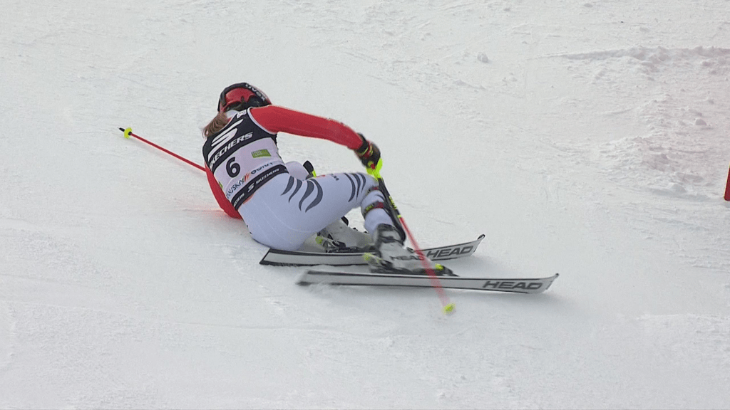 Katharina Liensberger (9.) javította a délelőtti hibát! Ugyan kezdésként eladott közel fél másodpercet, a meredeket viszont szinte tökéletesen síelte. Nem volt kérdés, rendkívül nagy előre lépésben reménykedhet. Neja Dvornik (17.) ugyan a vezetésért nem tudott harcban lenni, összességében azonban nem lehetett elkeseredve eredményével. Chiara Pogneaux-nak (25.) jócskán meggyűlt a baja a meredekkel, jelentősen visszaesett. Cornelia Öhlund (16.) jó kezdés után a meredeken maradt alul, ahogy Janine Mächler (21.) is. Katharina Huber (11.) már 66 százados előnyt épített ki a letörésig, de honfitársával szemben még ennyi sem volt elegendő, kettős osztrák vezetéshez azonban igen.
