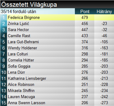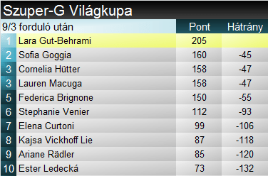 Stephanie Venier tucatnyi dobogónál tart a Világkupában, ennek felét lesiklásban, felét szuperóriásban szerezte. Idén először lett részese a ceremóniának. Federica Brignone pedig negyedjére, mégpedig a harmadik szakágában, ami jól megmutatja, miért tartják sokan őt az összetett legnagyobb esélyesének. A pontversenyt mindenesetre ő vezeti, a valószínűsíthető fő vetélytársát, a szakági tabellát most már egyedül vezető Gut-Behramit 105 egységgel előzi. Szuper-G-ben 21, összességében pedig 74 dobogónál tart.