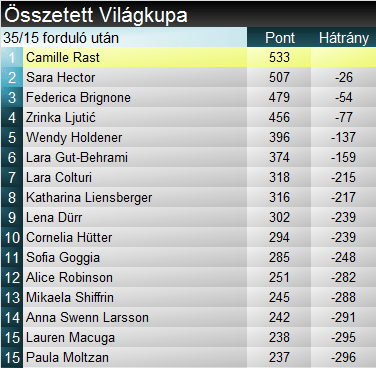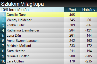 A szakági tabellán Rast jelentős előnybe került a versenyen nullázó eddigi éllovas Ljutić-csal szemben, utóbbit pedig az idén rendkívül kiegyensúlyozott szlalomformát mutató Holdener is megelőzte. Összetettben nyolcadik alkalommal történt váltás az élen, Rast itt is visszavette a vezetést, Brignonétől, és Hector ugrott a második helyre. Viszont Brignone a hétvégi cortinai versenyeken könnyedén visszaugorhat az élre. Rast és Hector esélyeit szuper-G-rajtok segíthetnék az összetettben, és előbbi Zinalon EK-versenyen indult is. Kérdés, a szezon előrehaladtával elvállalják-e az indulást gyorsasági számban.