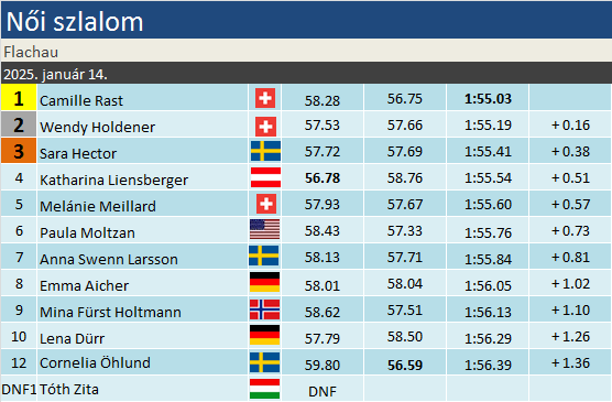 Camille Rast parádés másidik futammal, 1,5 másodperces lemaradásból, a 8. helyről zárkózva nyerte meg a flachaui villanyfényes szlalomot, miután az első futamot fölényesen megnyerő Katharina Liensberger nagyobb hiba után teljesen szétesett, és a negyedik helyig csúszott vissza. Rast eredményével a szakági és az összetett pontverseny élén is visszavette a vezetést, előbbiben ráadásul nagyobb előnnyel, miután az eddigi éllovas Ljutić az első futamban hibázott. Wendy Holdener révén a svájciak kettős győzelmet ünnepelhettek, míg Sara Hector egy év után állt ismét szlalomverseny dobogójára. Tóth Zita sajnos elizgulta futamát, nagyon hamar kiesett.