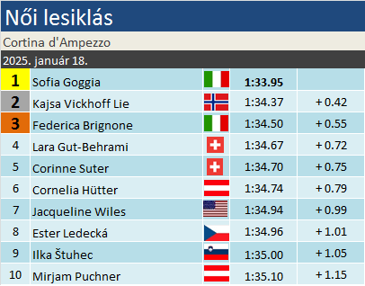 A világkupa, női szempontból legfrekventáltabb helyszínén, Cortina d’Ampezzón folytatódott a női alpesi sízők világkupája. Az egyik legikonikusabb, legnagyobb presztízzsel bíró hétvégéje ez a női naptárnak. Idén ráadásul mindez a jövő évi olimpia főpróbájának is tekinthető. A nyolc állomásosra tervezett naptárból még mindössze két versenyt rendeztek a mai előtt, Beaver Creeken és Sankt Antonban. Az előbbit a szakági címvédő Hütter, utóbbi az összetett aspiráns Brignone nyerte meg.