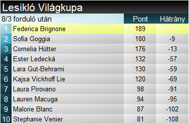 A szakági pontversenyben továbbra is rendkívül szoros az állás, három futamot követően. Brignone mindössze 9 ponttal előzi a mai győztes Goggiát, míg a verseny előtt vezető Hütter a haramdik helyre csúszott vissza, de hátránya neki is csak 13 pont. Összetettben visszavette a vezetést Brignone, ráadásul 10 pontot tudott ma adni Gut-Behraminak is. Ha holnap is dobogón végez az olasz, akkor Rastnak és Hectornak Kronplatzon sem lesz esélye visszaelőzni Brignonét.