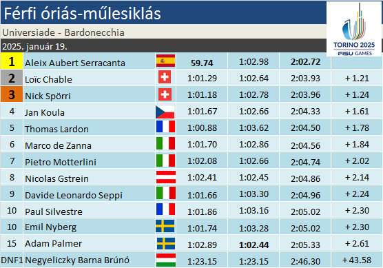 Szuper-G után óriásban is a spanyol csapat képviselője vitte a prímet, régiókat tekintve baszk után ma katalán siker született. Aleix Aubert Serracanta már délelőtt másodperc fölötti előnyt épített ki magának, ez pedig bőven megfelelt a fokozatosan romló pálya ellenére is. A dobogón két svájci fiatalember, Loïc Chable és Nick Spörri fogta közre a bajnokot. Negyeliczky Barna Brúnó a 75. helyen fejezte be élete első világversenyét.