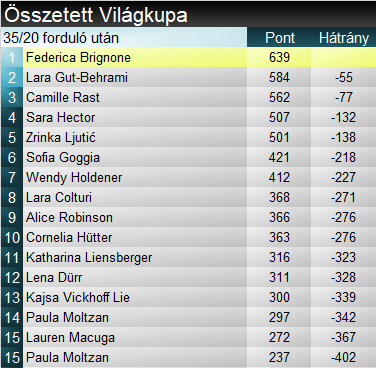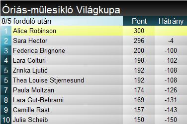 Szakági világkupában Robinson 4 ponttal átvette a vezetést Hector előtt. Brignone előtt ott volt az esély, hogy Kranjska gora-i kiesésével Hectorral szemben megnőtt hátrányát behozza, így már 100 pontos a lemaradása Robinson mögött. Összetettben is sokba fájhat a kiesés az olasznak, ugyanis Gut-Behrami hirtelen 55 pontra faragta hátrányát, így ismét rendkívül nyitott a verseny a nagy kristálygömbért.