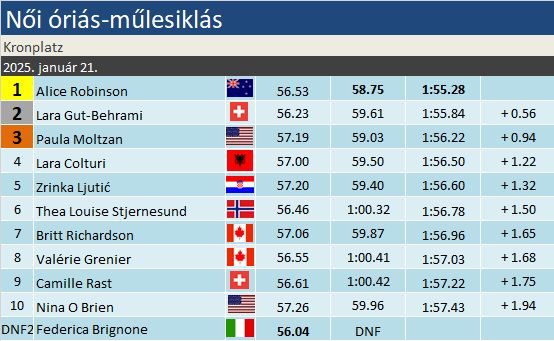 Lara Gut-Behrami 95. dobogóját ünnepelhette, az idei 5 alkalomból viszont még mindig nem tudott egyszer sem győzni. Óriásban 26. alkalommal végzett a legjobb 3-ban, idén először. Paula Moltzan karrierje során immár négyszer állhatott dobogóra, de először óriásban. Idén már két top5-ös helyezéssel mutatta jó formáját a számban, ezt váltotta most dobogóra.