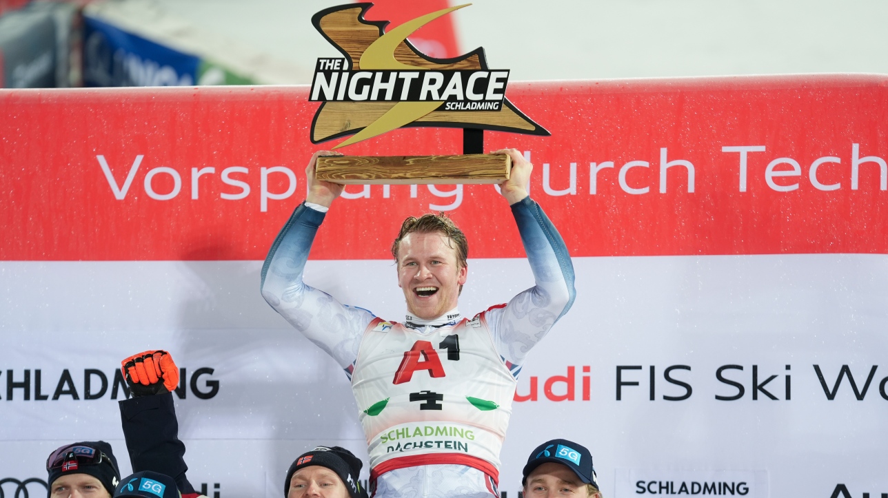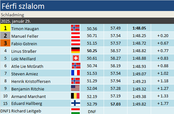 Fordulatos az időjárás által kevésbé befolyásolt versenyt rendeztek szerdán Schladmingban. A tűzőknek köszönhetően két merőben más stílusú, egy szélvészgyors és egy rendkívül technikás pályát kellett teljesíteni a sízőknek. Közülük Timon Haugan bizonyult a legjobbnak, miután a második futamban megelőzte a saját edzője által tűzött pályán síző Linus Straßert. Az első futamot nyerő német a dobogóról is lecsúszott. Az osztrákok viszont ünnepelhettek, Manuel Feller idén, míg Fabio Gstrein karrierje során legelső alkalommal állhatott fel a dobogóra! A szakági éllovas Noël kiesett, így Kristoffersen gyengébb eredménnyel is átvette a potnverseny veetését.
