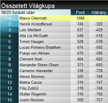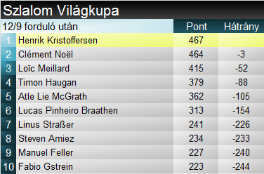 A szakági világkupában Kristoffersen nem tudott sokat profitálni Noël kieséséből, mindössze 3 ponttal vette át a vezetést. Meilalrd és Haugan továbbra is versenyben van az első helyért, McGrath és Braathen viszont 100 ponton túli lemaradással áll már. Összetettben a helyzet változatlan.