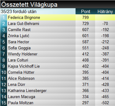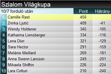 Zrinka Ljutić harmadik győzelmét aratta a Világkupában, egyszersmind ebben a szezonban. Másodjára verte tönkre a mezőnyt, jelen pillanatban olybá tűnik, csak rajta múlik, hogy milyen érmet szerez a világbajnokságon. A szakági tabellán nagyot zárkózott a stabilabb, de nyilvánvalóan lassabb Raston. E tekintetben is a horvát tűnik favoritnak. Mai kiesése nagyon sokba fájhat még Holdenernek. Sara Hector harmadik alkalommal állt dobogóra szlalomban, mostani eredménye karriercsúcs, korábban két harmadik helye volt. Lena Dürr 15 szakági pódiumnál tart, a harmadikat szerezte ezen a télen.